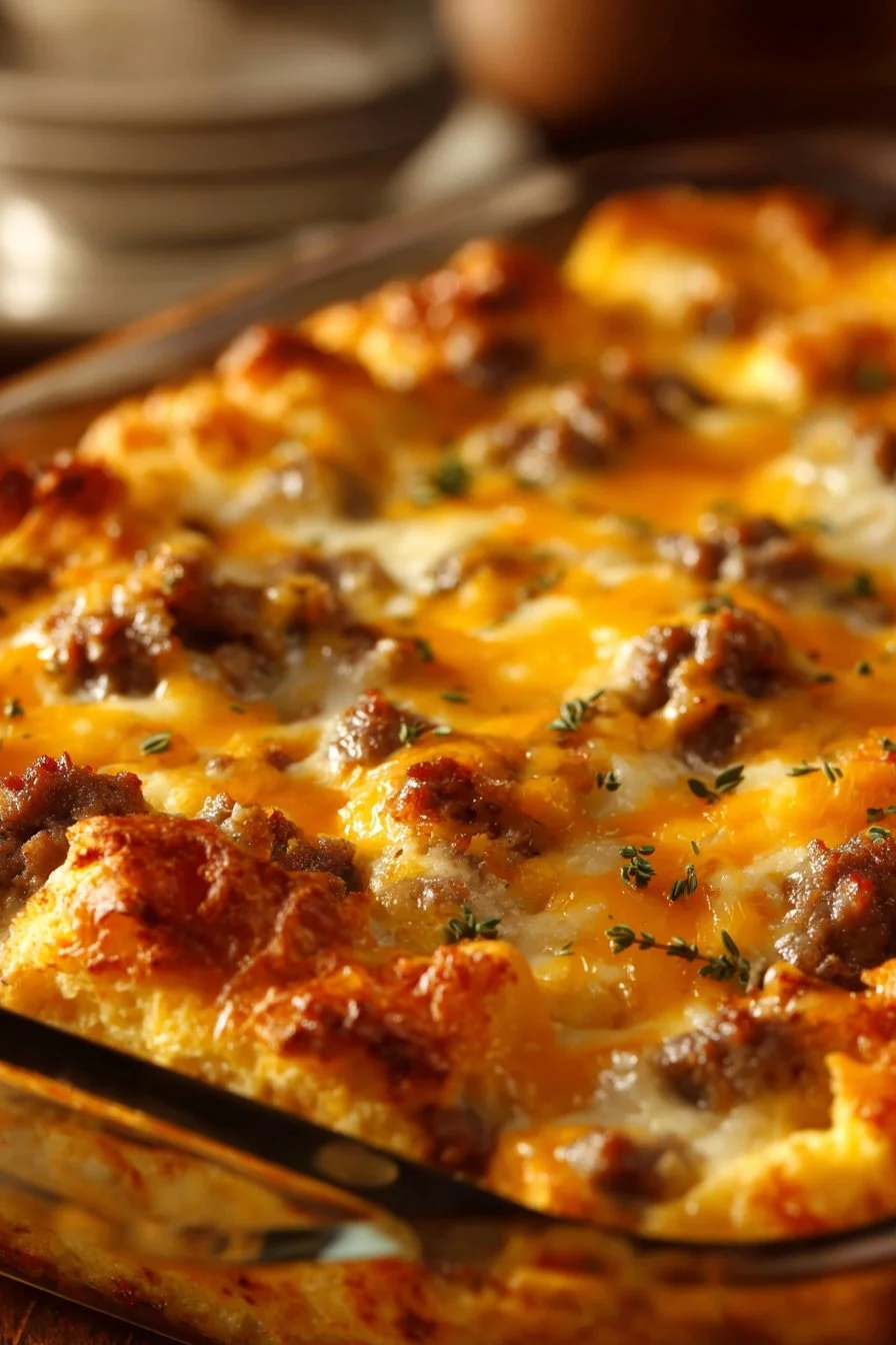 A warm, hearty casserole combining savory sausage, creamy cheese, and fluffy eggs, perfect for brunch or gatherings.