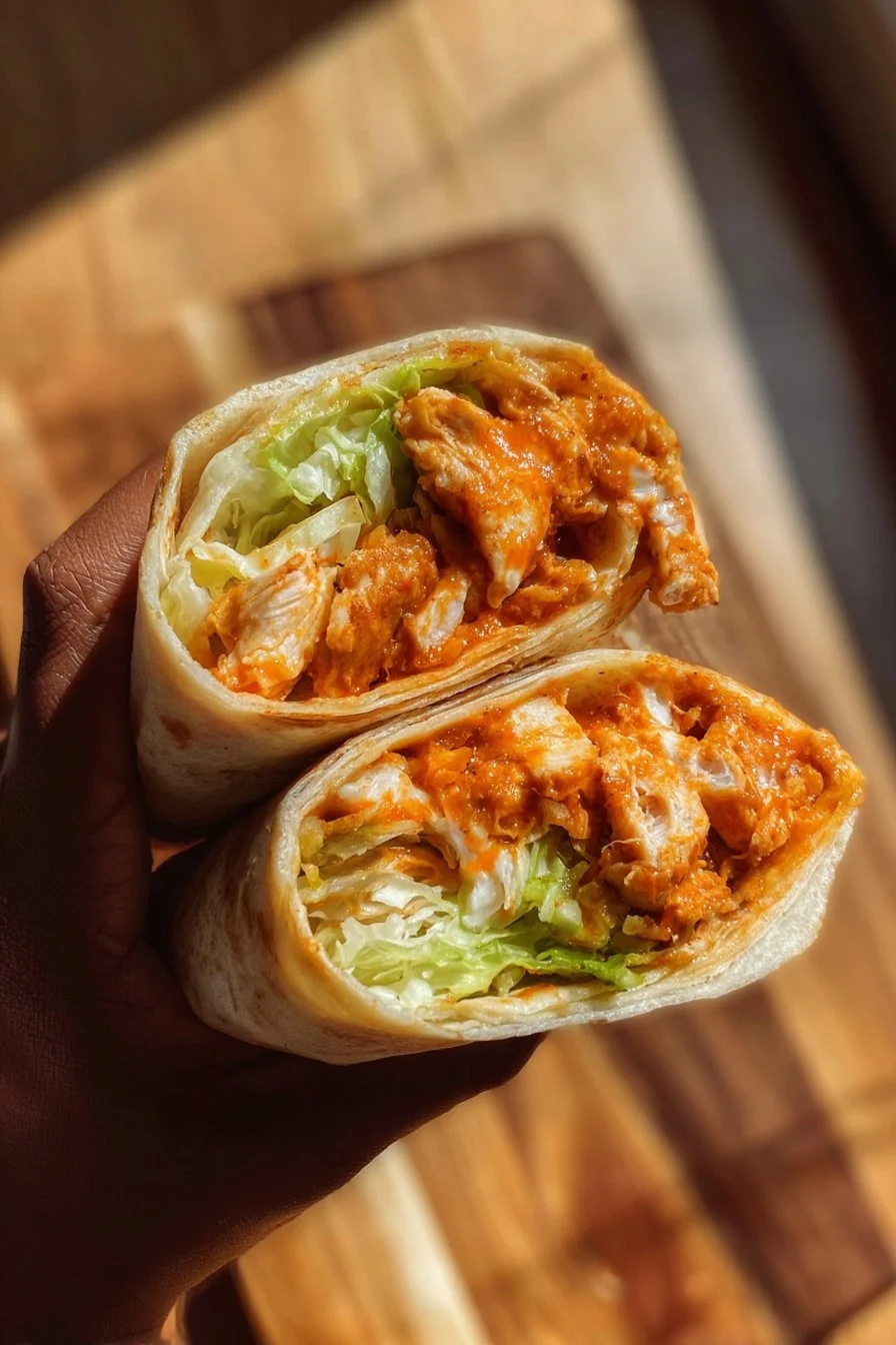 This buffalo chicken wrap comes together in just a few easy steps. You’ll start by cooking frozen chicken tenders according to package instructions, tossing them in buffalo sauce once they’re crispy. Then, layer your tortilla with fresh lettuce, the buffalo chicken, shredded cheese, and a drizzle of ranch. Roll it tightly, slice it in half, and it’s ready to enjoy!