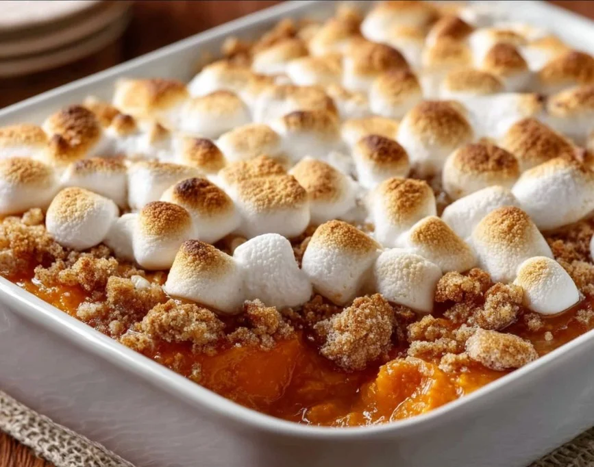 Deliciously sweet and buttery candied yams, drizzled with a rich brown sugar glaze and topped with mini marshmallows, perfect for any occasion.