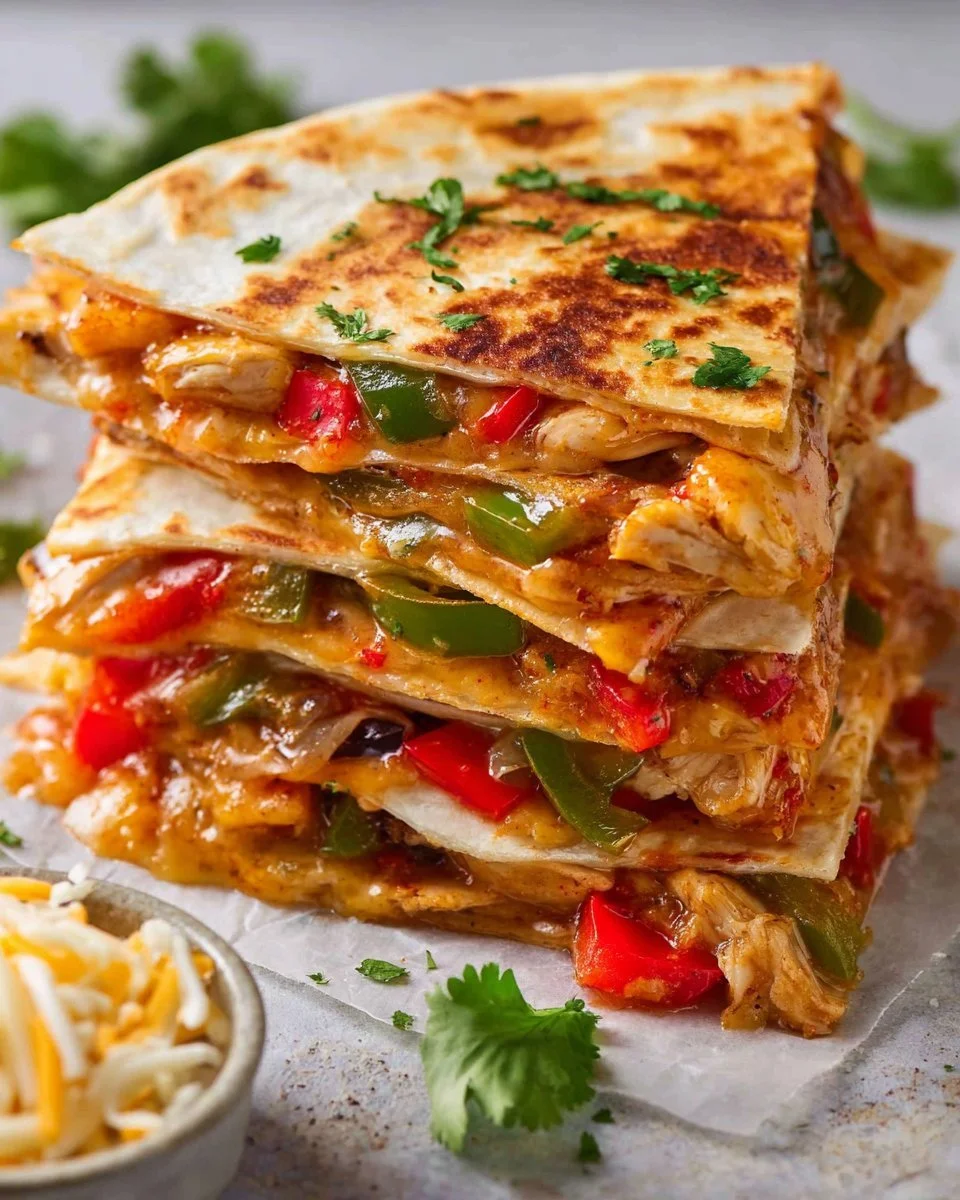 What makes these quesadillas special is the contrast of textures and flavors. The crispy tortillas enveloping the gooey melted cheese and tender chicken, combined with fresh veggies, create an irresistible bite. Perfect for a quick dinner or even a casual gathering, this dish is versatile and can be customized with your favorite ingredients.