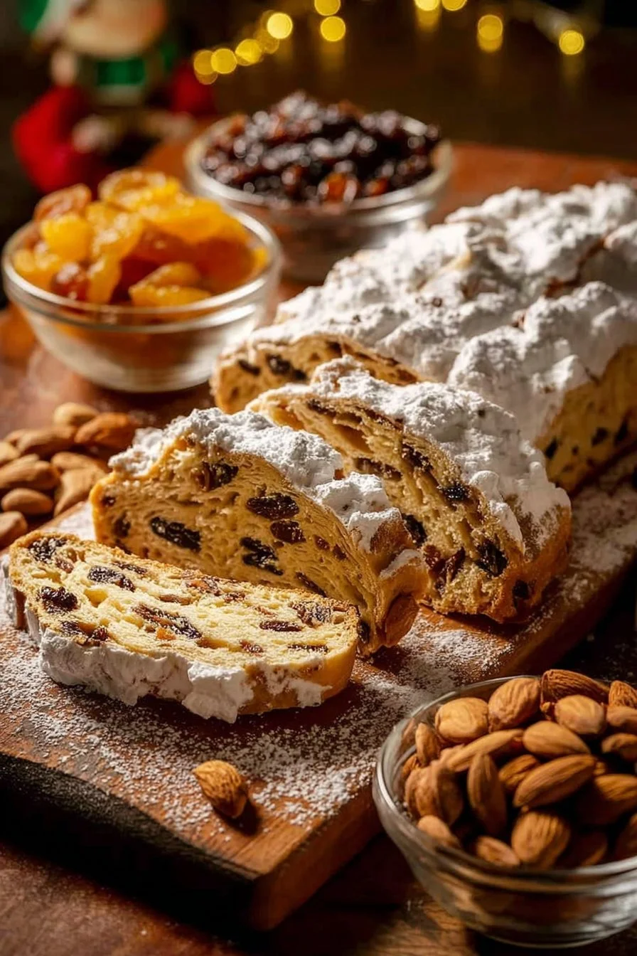 Stollen is a traditional German bread filled with dried fruits, nuts, and spices, typically enjoyed during the holiday season. It is often covered with powdered sugar.