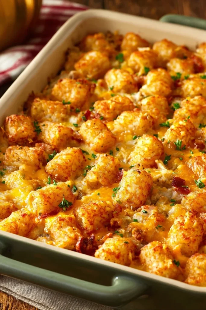 A warm, cheesy casserole combining crunchy tater tots with a creamy filling of chicken, cheddar cheese, and bacon, perfect for family gatherings or cozy nights in.