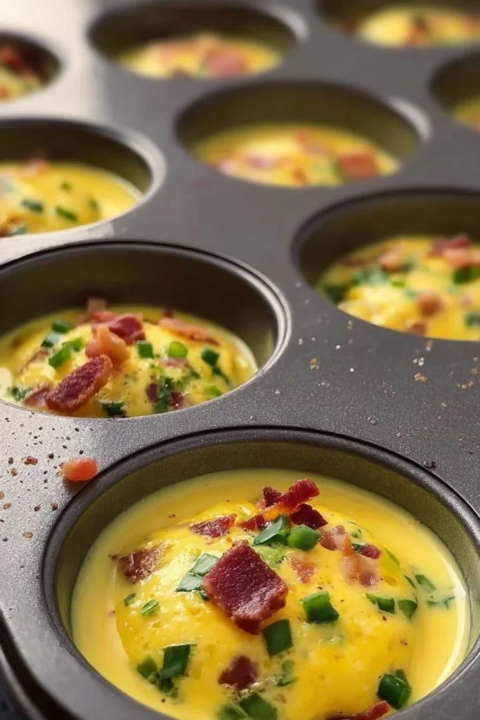 A quick prep of vegetables and cooked bacon or ham, then divide the chopped veggies and some bacon into greased muffin cups. Whisk the eggs with half-and-half, salt, pepper, and most of the cheese, pour into the cups, top with reserved bacon and cheese, and bake until set. Expect a gentle puff while baking and a slight deflation as they cool.