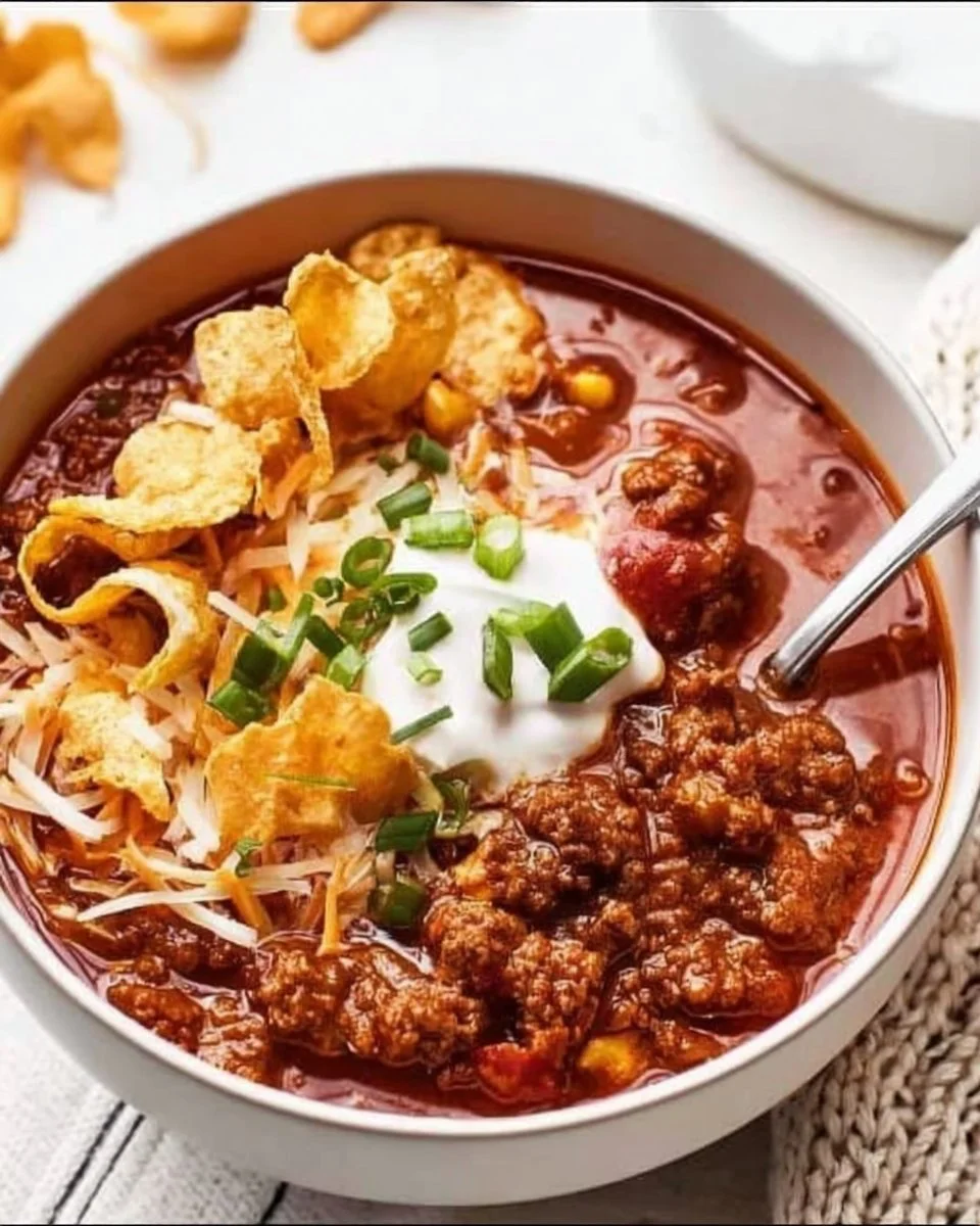 This chili is delicious on its own or served with a side of cornbread. Top each bowl with shredded cheese, a dollop of sour cream, and fresh green onions for that extra pop of flavor. It also pairs wonderfully with tortilla chips for a delightful crunch.