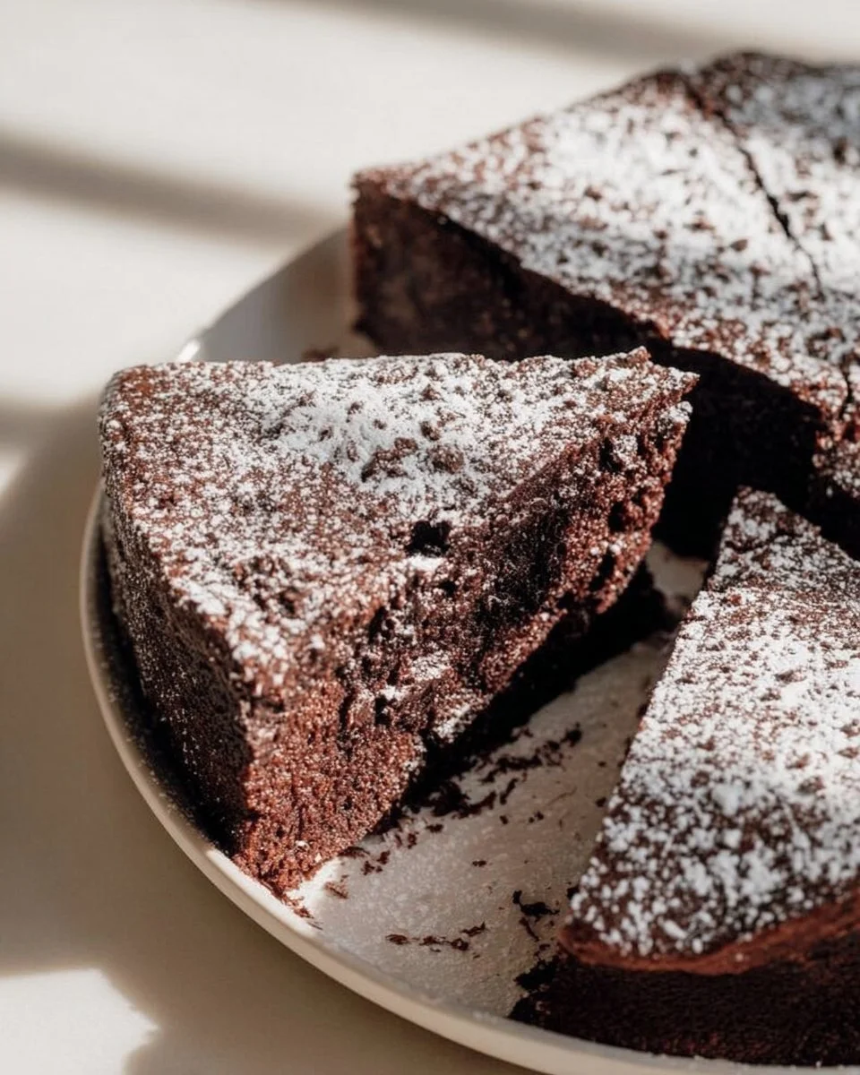 Delicious flourless chocolate cake with a creamy texture and chocolate ganache.