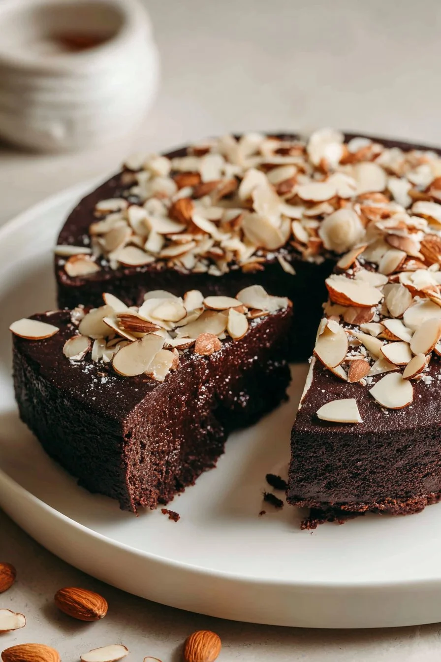 What makes this cake truly special is its indulgent texture and luxurious flavor. It’s a chocolate lover’s dream, offering a fudgy consistency that’s both satisfying and rich without being overly sweet. Topped with a creamy dark chocolate ganache and a sprinkle of toasted almonds for extra crunch, each bite offers a perfect blend of smooth and nutty, making it a delightful experience for your taste buds.
