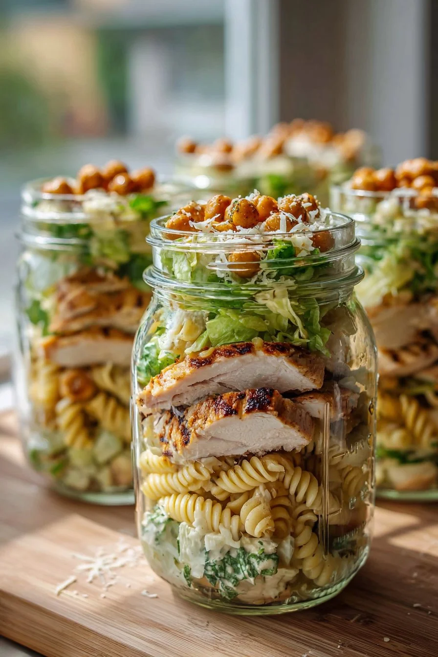 - Layer the jars: Begin with the dressing at the bottom, followed by pasta, grilled chicken, Parmesan, crispy chickpeas, and finish with romaine lettuce on top.