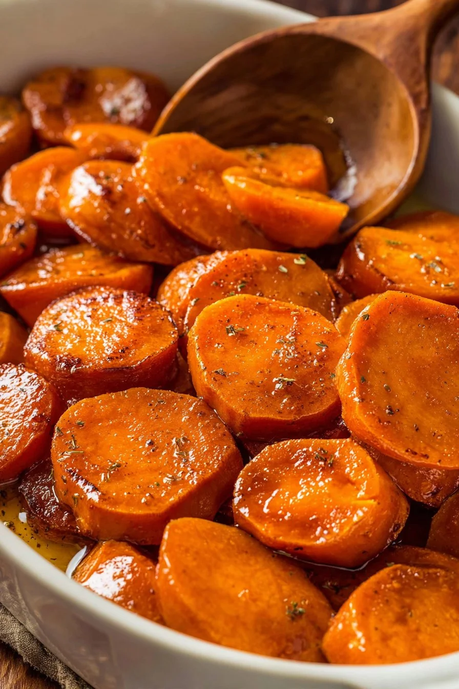 Making candied sweet potatoes is straightforward. You’ll blend sweet potatoes with a rich sauce and bake until tender and caramelized.