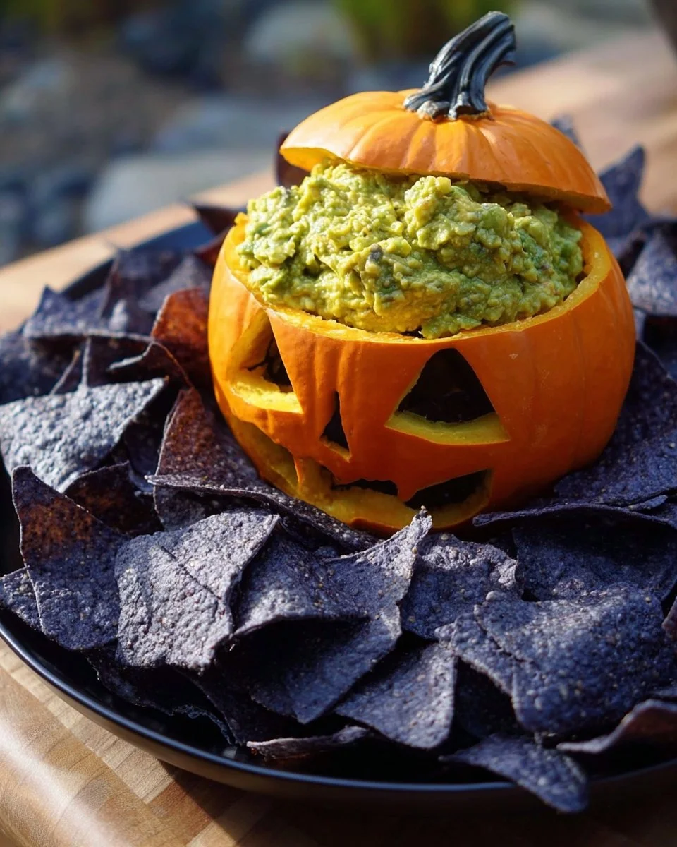 A festive and zesty guacamole served in a hollowed-out pumpkin, perfect for Halloween gatherings.
