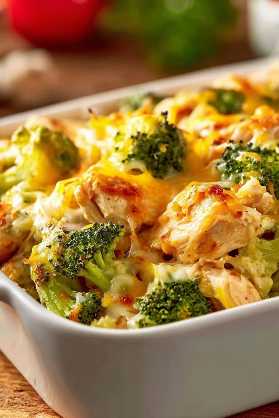 A comforting low-carb casserole featuring shredded chicken, broccoli, and cauliflower rice, baked to perfection with creamy cheese.