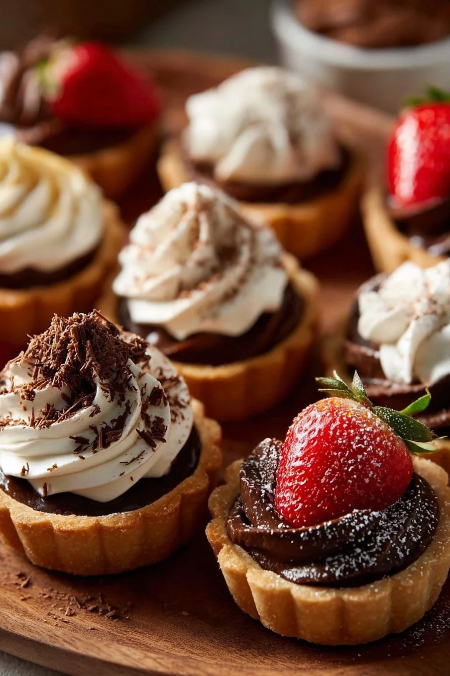 Start by preparing the tart shells, then make the chocolate ganache filling and pour it into the cooled shells. After chilling, these mini chocolate tarts are ready for their toppings.