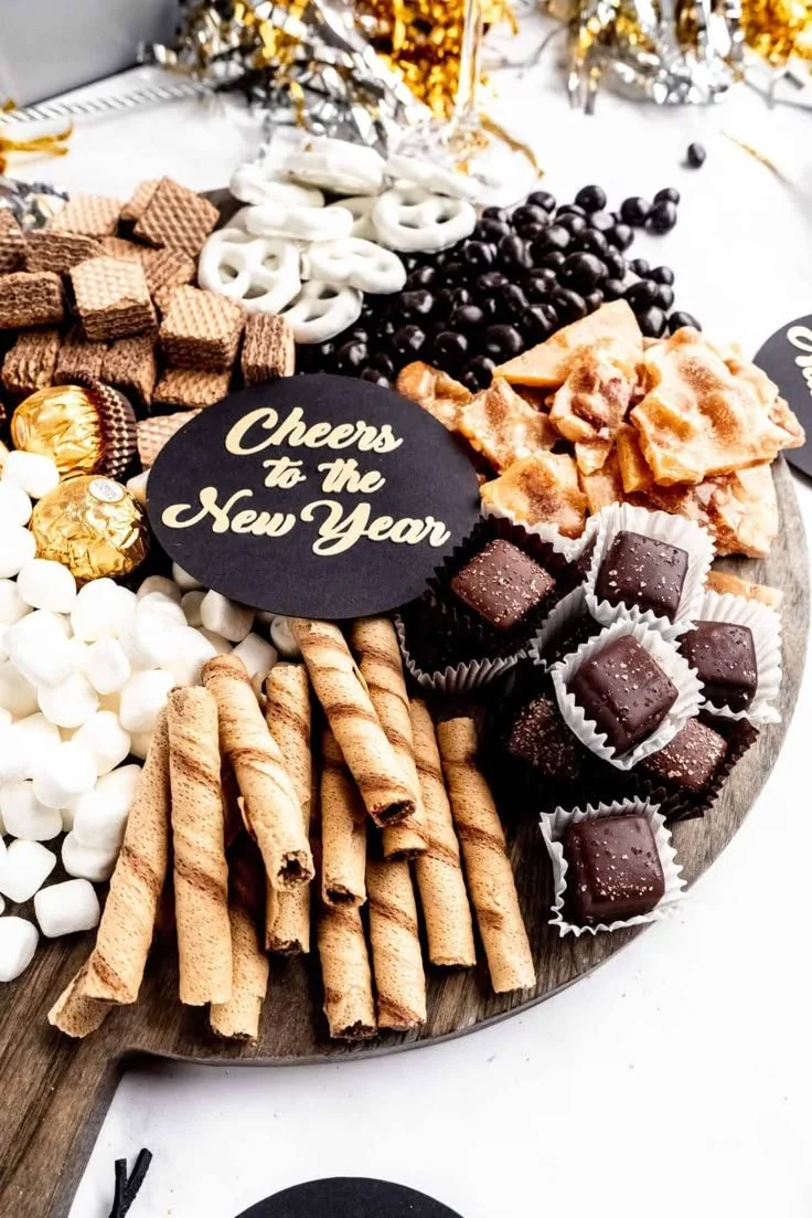 Creating a New Year’s Eve dessert charcuterie board is a refreshing and enjoyable experience. Start by gathering your assorted chocolates, cookies, fruit, cheeses, and nuts. Arrange these delightful items on a wooden board or platter, filling any gaps with crackers and dips for added variety. To round off the presentation, incorporate festive decorative elements that will make the board pop. Finally, serve it to your eager guests as everyone counts down to the new year.