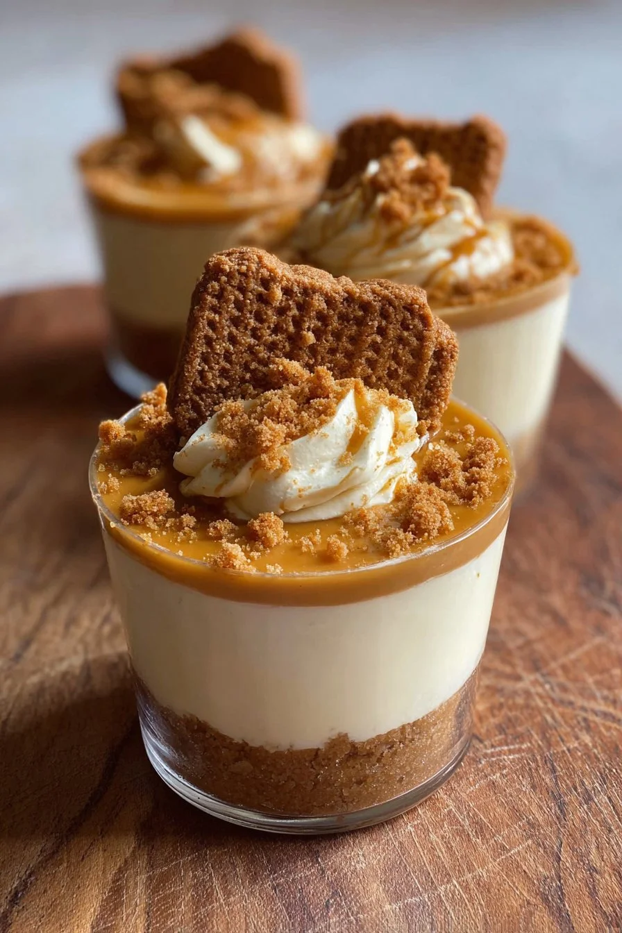 These no-bake Biscoff cheesecake cups are a creamy and decadent treat, layered with a crunchy cookie base and topped with Biscoff spread, perfect for any gathering.