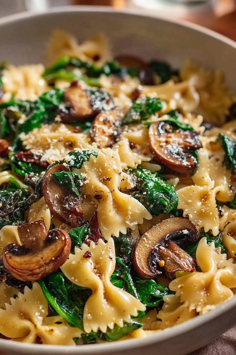 This pasta dish comes together beautifully in just a few steps. You’ll start by cooking the farfalle pasta and sautéing the garlic and mushrooms in olive oil until tender. After wilting the spinach and tossing everything together with Parmesan, you’ll have a rich, flavorful dish that’s perfect warm from the stove.