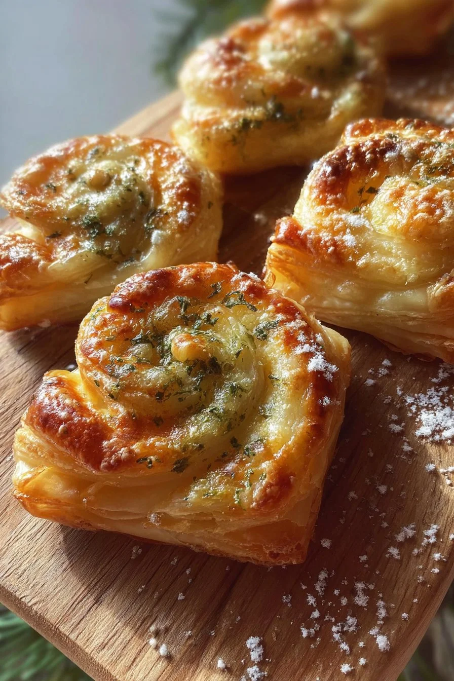 A flaky, buttery pastry filled with savory cheese and pesto, perfect for snacks or appetizers.
