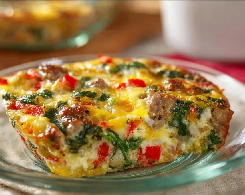 A hearty, protein-packed breakfast casserole with eggs, savory sausage, and vibrant veggies, perfect for both busy mornings and cozy weekends.