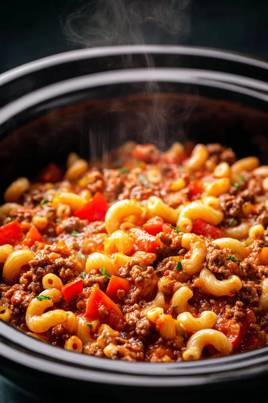 A comforting and hearty goulash made in a slow cooker, blending tender beef, macaroni, and a bold tomato sauce for a satisfying meal.