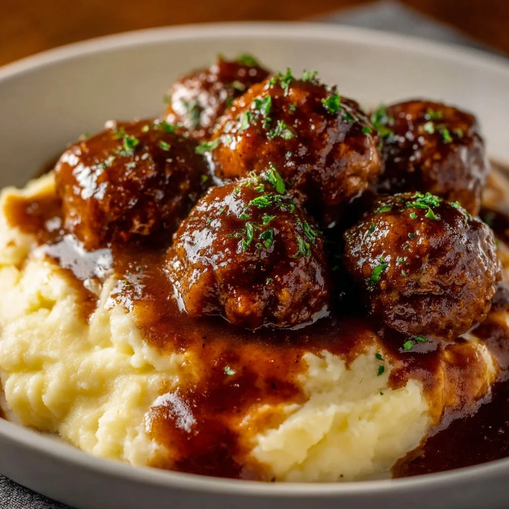 A comforting and easy dish featuring tender meatballs in savory gravy, perfect over mashed potatoes or egg noodles.
