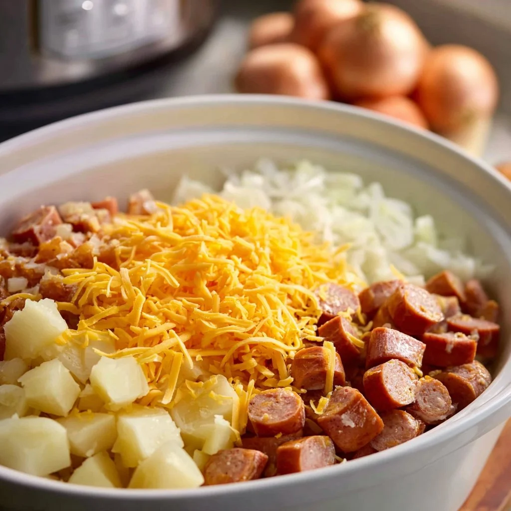 - Start by combining the hash browns, kielbasa, diced onion, and 2 cups of shredded cheddar cheese in a greased slow cooker. Some find it helpful to sauté the sausage and onions for added flavor before placing them in the slow cooker.