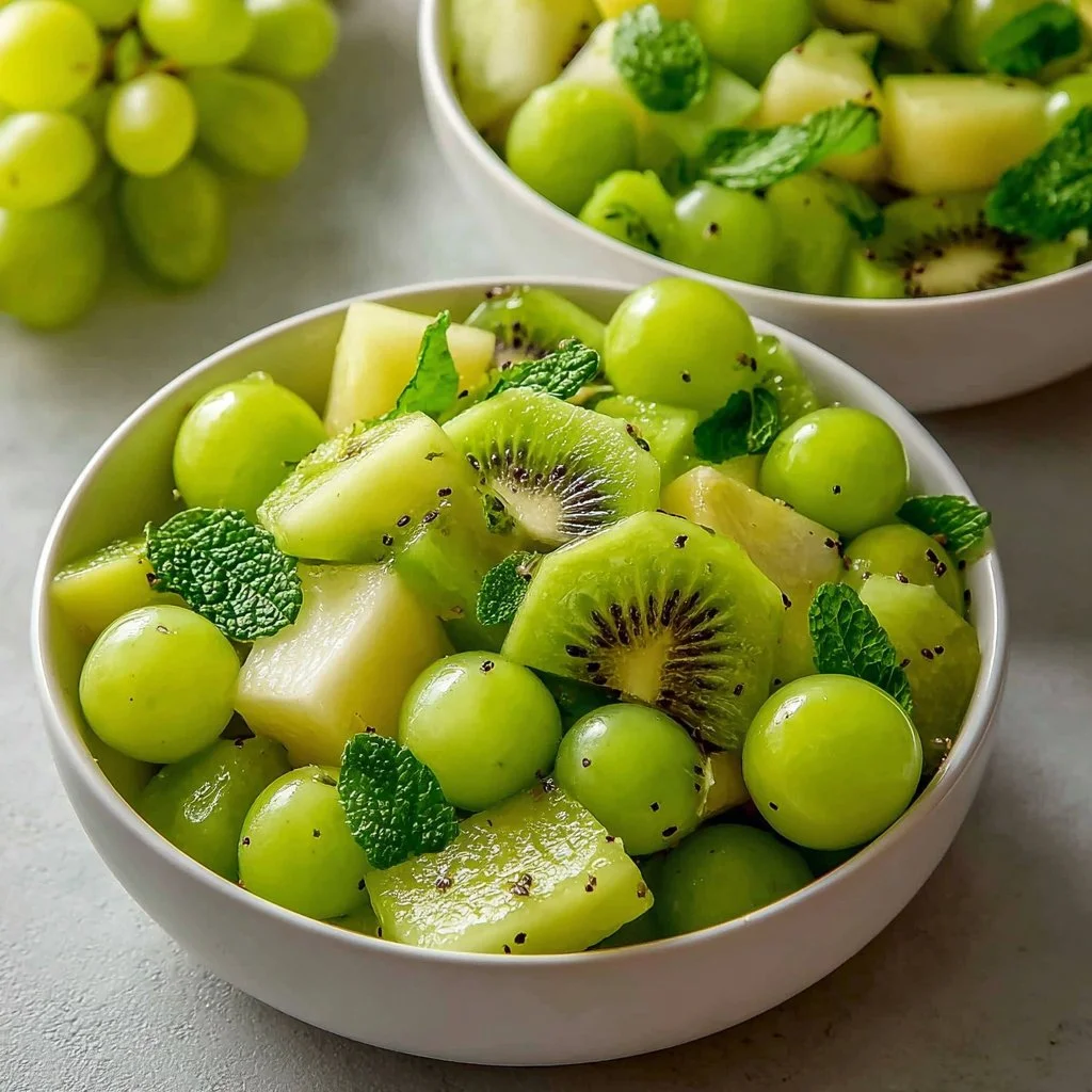 To make this refreshing green fruit salad, simply cut your fresh fruits into bite-sized pieces, combine them in a large bowl, and drizzle with honey and lime juice. Toss gently to mix, and it’s ready to serve!