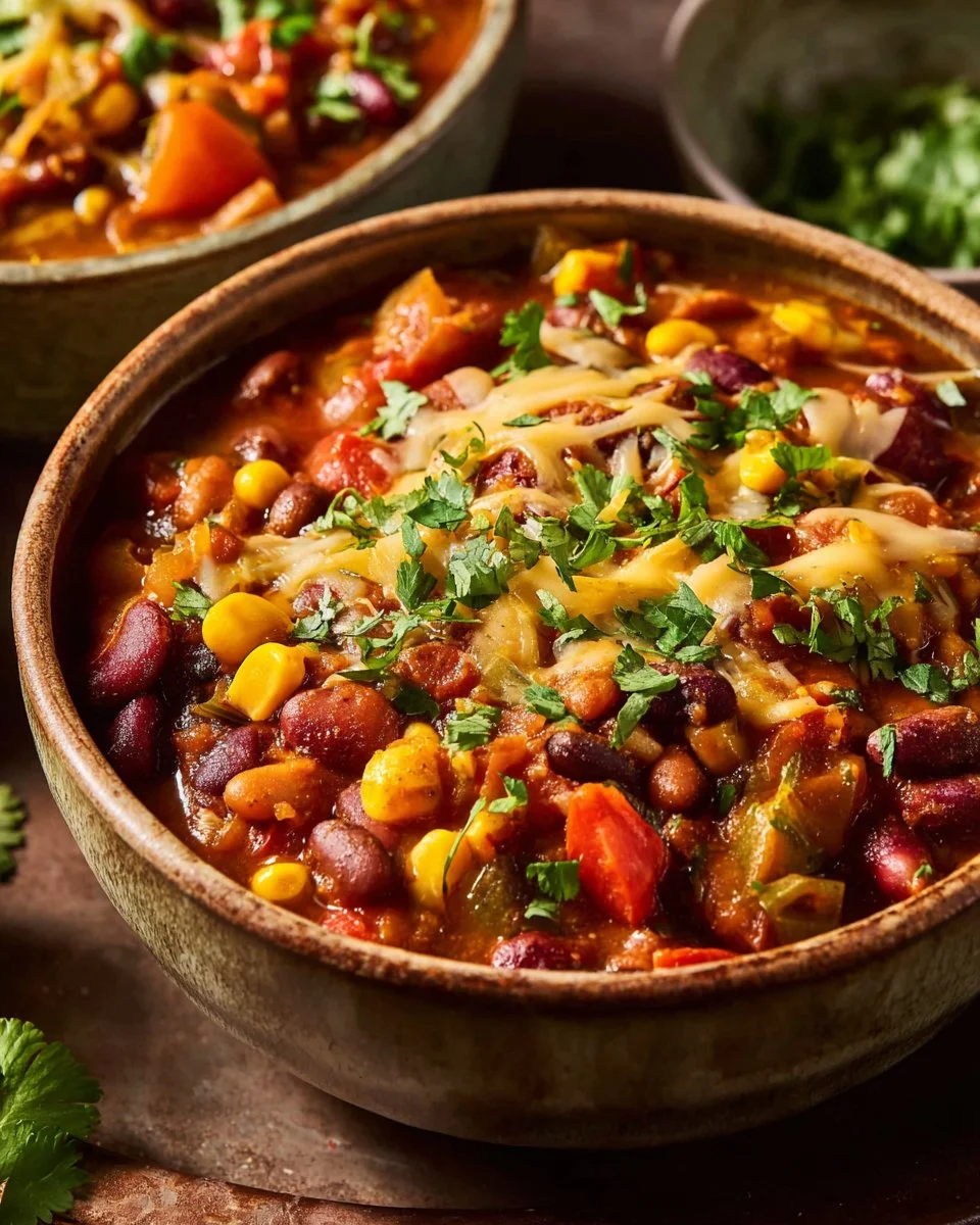 What makes this vegetarian chili special is its rich, robust flavor, thanks in part to a medley of spices and fresh vegetables that create a satisfying texture. Perfect for anyone looking to enjoy a plant-based meal, this dish not only warms you up but also fills you with wholesome goodness.